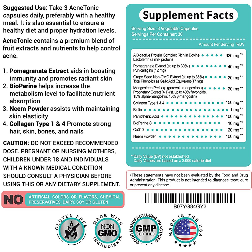 AcneTonic is a new generation dietary supplement formulated using all-natural ingredients such as POMEGRANATE, COLLAGEN TYPES I & IV, MANGOSTEEN, and others.